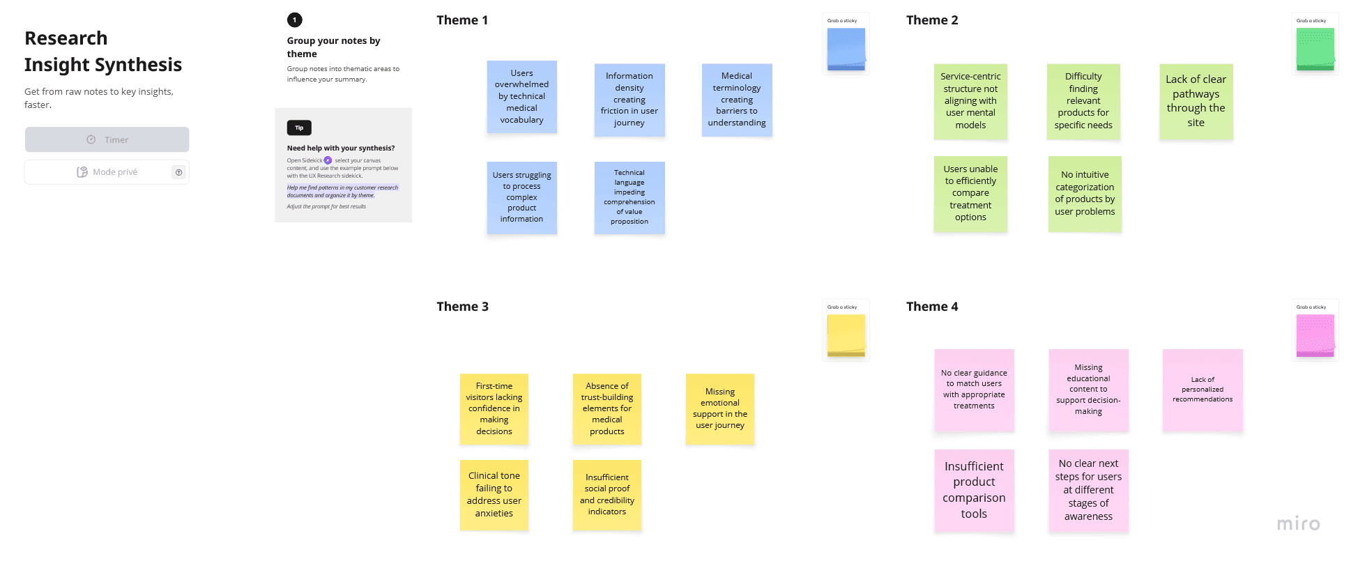 The sticky notes highlight specific issues within each theme, making it easier to identify patterns and prioritize solutions.