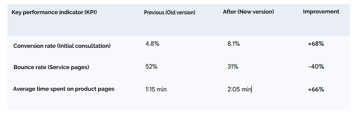 The implementation of the new design was a success, as measured by the following key performance indicators (KPIs) (over a 3-month period):